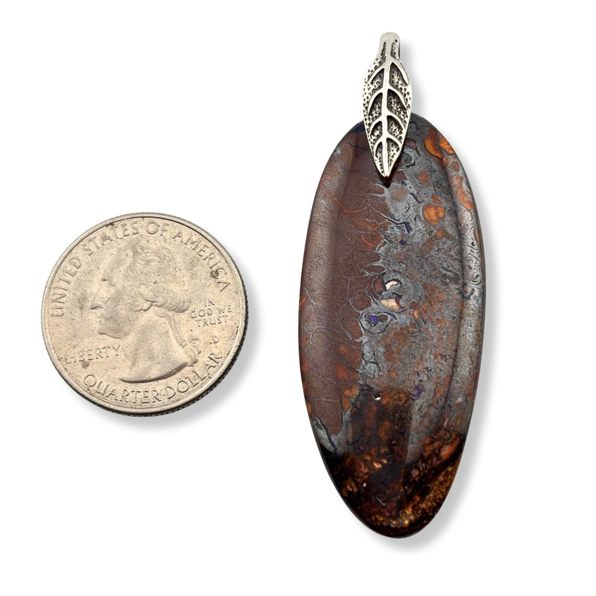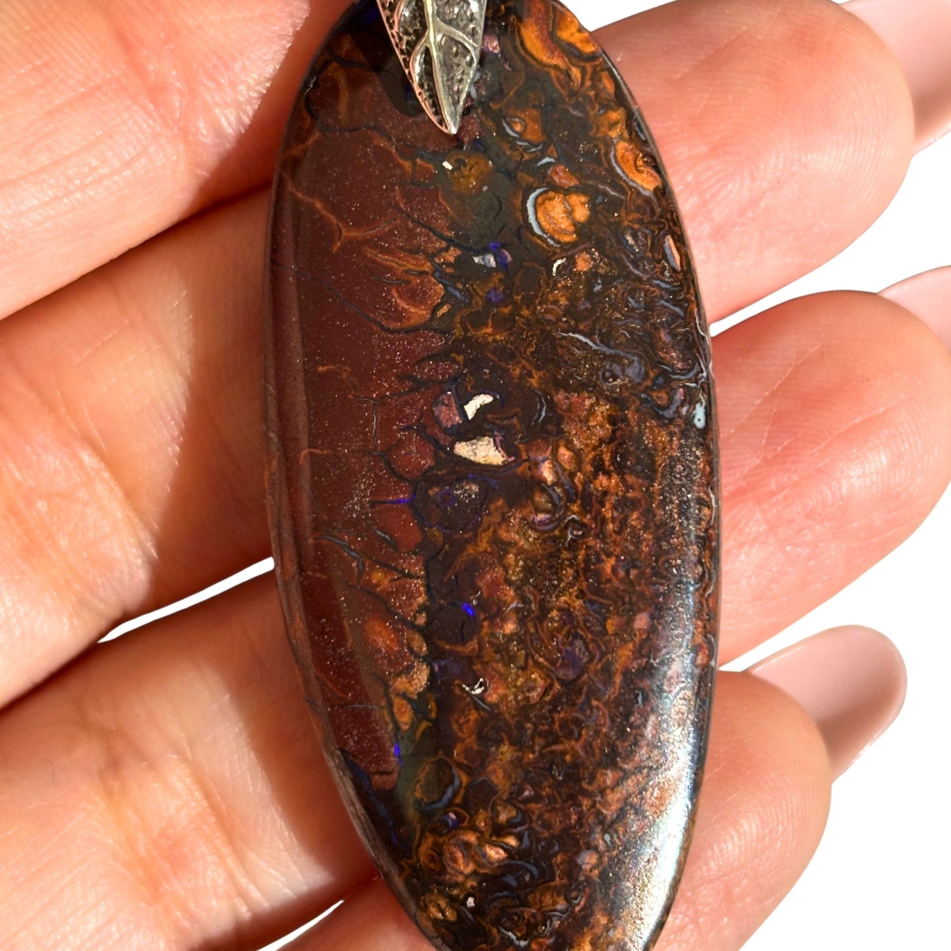 Australian Boulder Opal exhibits a stunning contrast between opal’s play of color and its rich brown host rock. This elongated oval pendant has tiny flashes of blue from the opal and some gorgeous patterns in the rock.