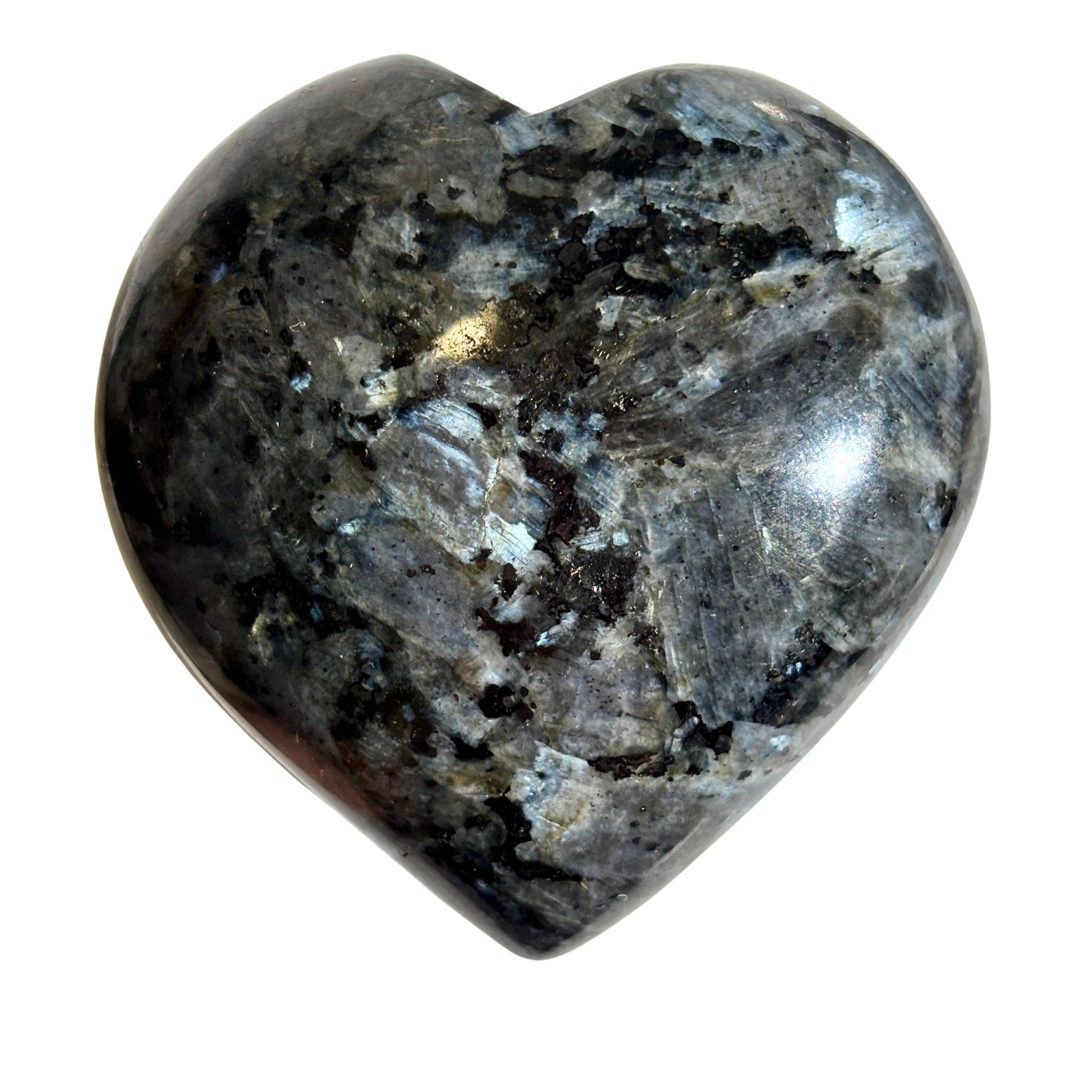 Polished Larvikite hearts reflect subtle flashes of silver across dark gray and black feldspar.SizesMedium: 1.5 to 2 in, 60 to 85gLarge: 2 to 2.5 in, 85 to 115gOrigin: IndiaLarvikite is associated with cognition, protection, and transformation.